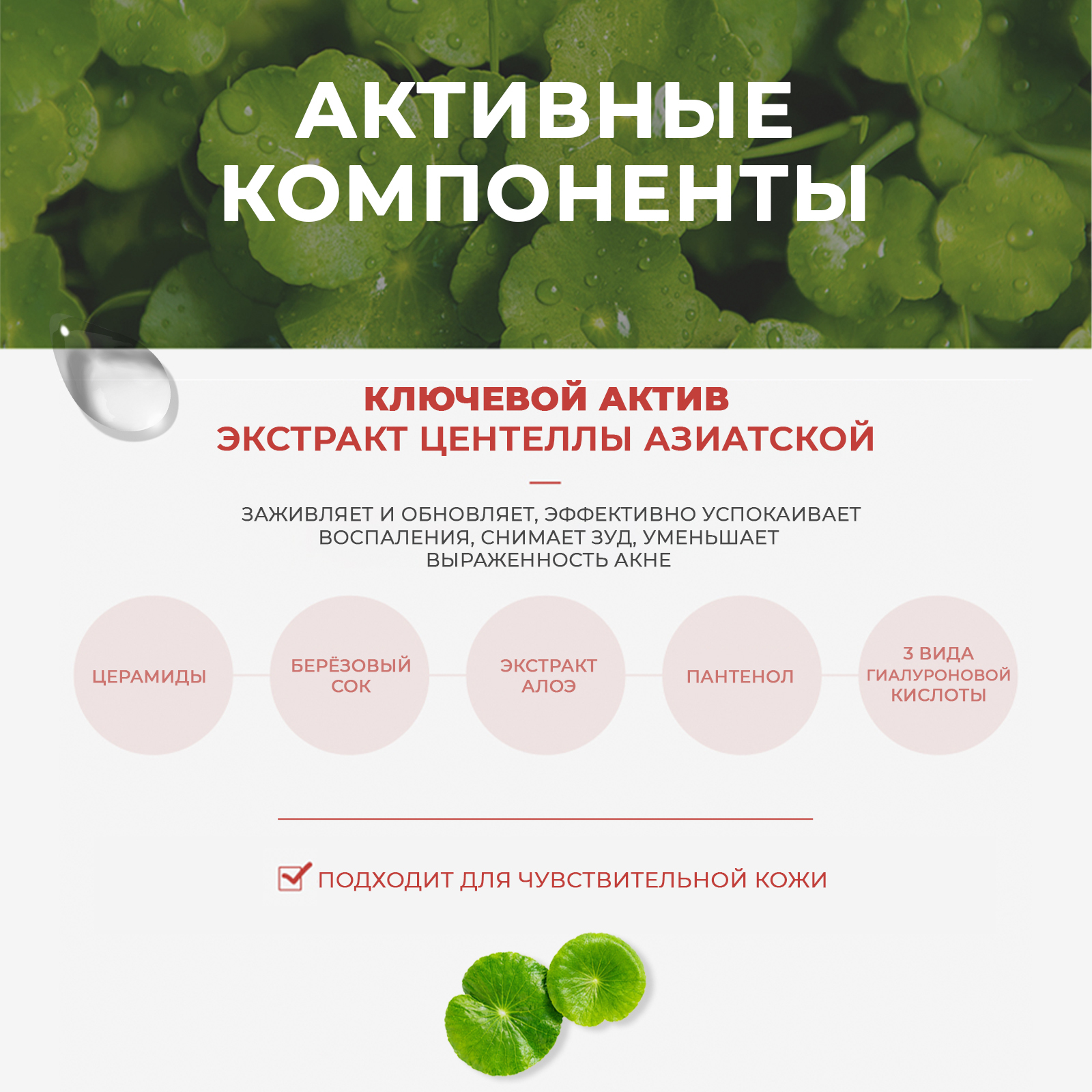 - Экстракт центеллы азиатской обладает выраженным заживляющим и обновляющим действием, эффективно успокаивает раздражённую кожу, снимает зуд и покраснение, ускоряет процессы заживления воспалений, уменьшает выраженность акне и способствует осветлению постакне.