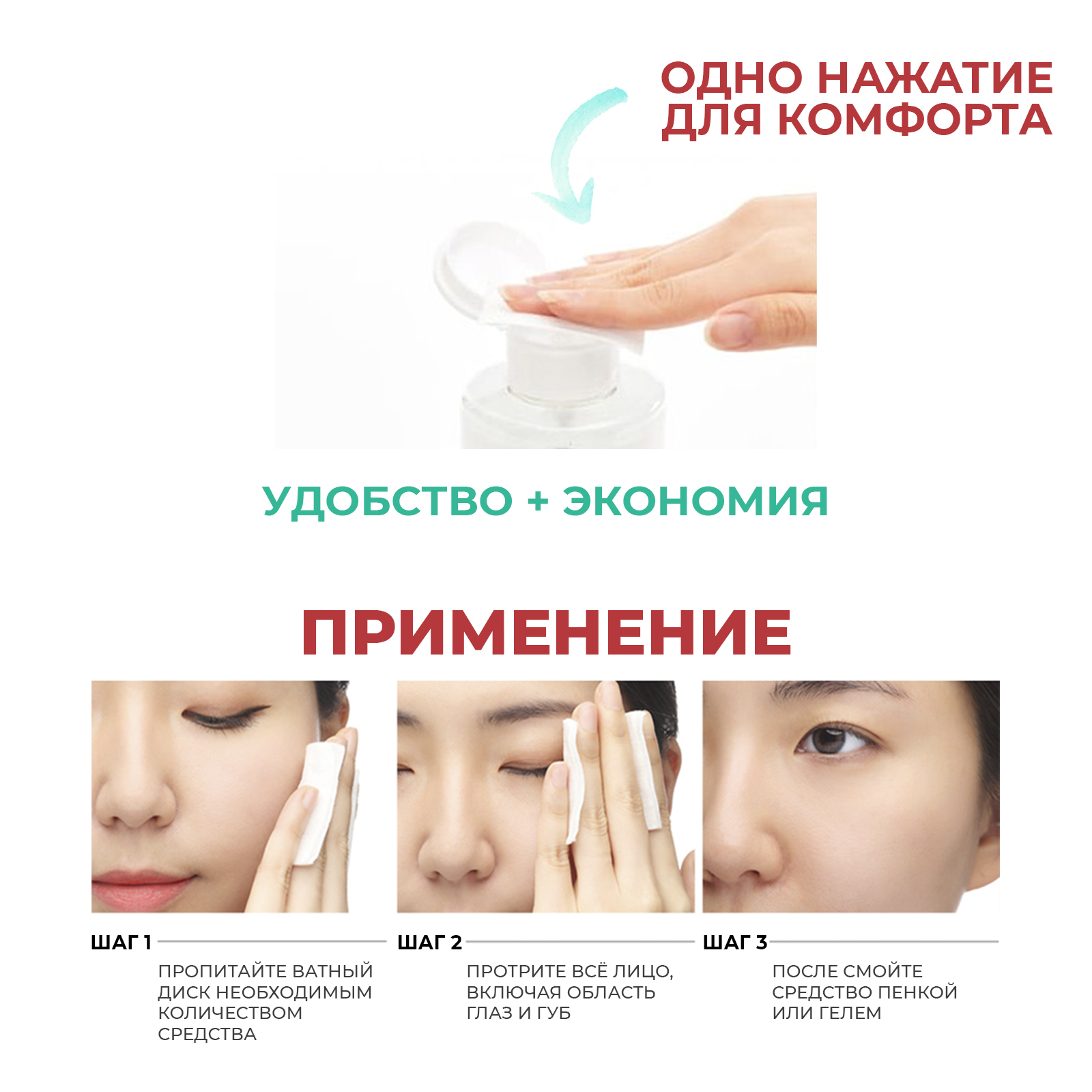 Способ применения: пропитайте ватный диск необходимым количеством средства и протрите всё лицо, включая область глаз и губ. Не требует смывания. Подходит для всех типов кожи, включая чувствительную.