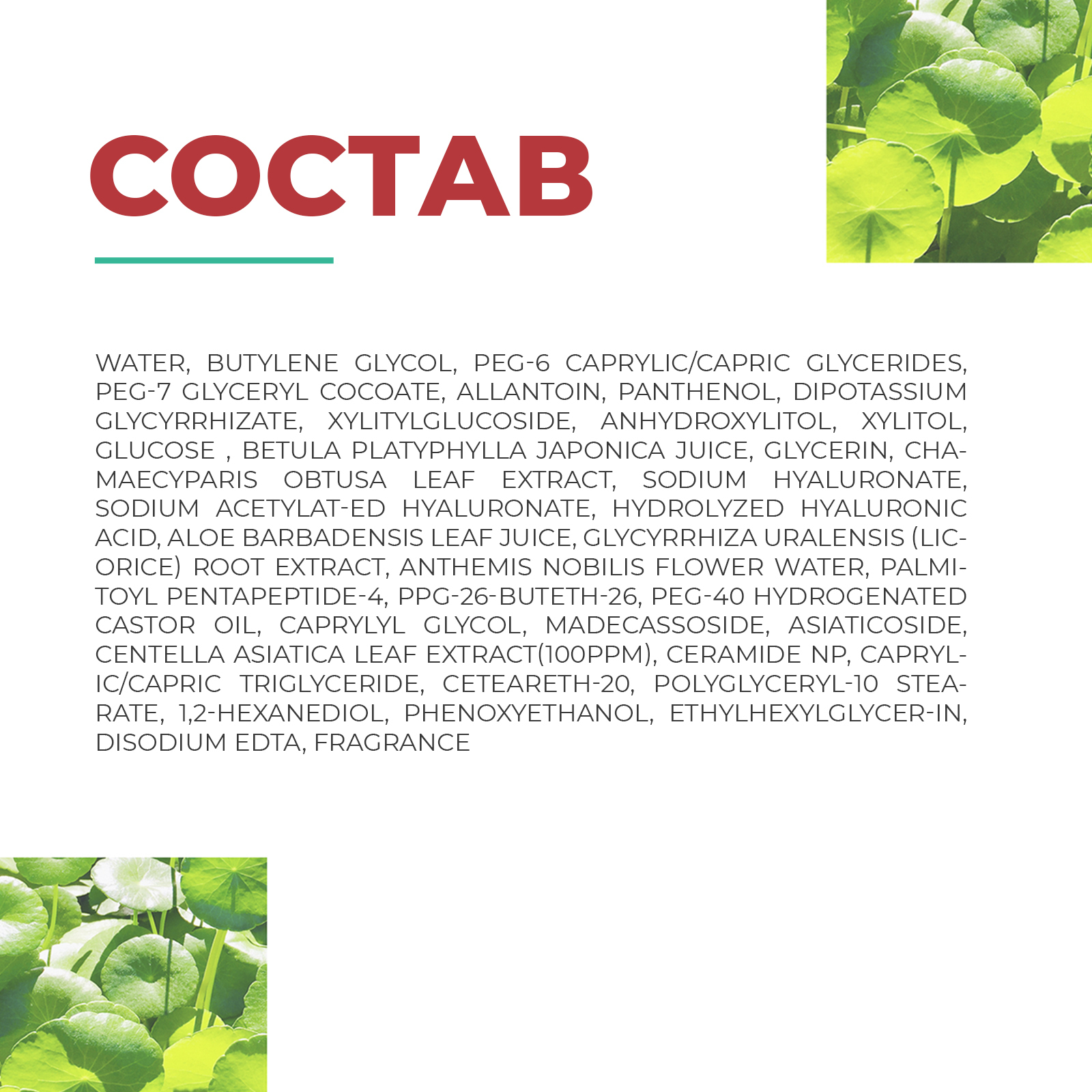 Состав: Water, Butylene Glycol, PEG-6 Caprylic/Capric Glycerides, PEG-7 Glyceryl Cocoate, Allantoin, Panthenol, Dipotassium Glycyrrhizate, Xylitylglucoside, Anhydroxylitol, Xylitol, Glucose , Betula Platyphylla Japonica Juice, Glycerin, Chamaecyparis Obtusa Leaf Extract, Sodium Hyaluronate, Sodium Acetylat-Ed Hyaluronate, Hydrolyzed Hyaluronic Acid, Aloe Barbadensis Leaf Juice, Glycyrrhiza Uralensis (Licorice) Root Extract, Anthemis Nobilis Flower Water, Palmitoyl Pentapeptide-4, PPG-26-Buteth-26, PEG-40 Hydrogenated Castor Oil, Caprylyl Glycol, Madecassoside, Asiaticoside, Centella Asiatica Leaf Extract(100ppm), Ceramide NP, Caprylic/Capric Triglyceride, Ceteareth-20, Polyglyceryl-10 Stearate, 1,2-Hexanediol, Phenoxyethanol, Ethylhexylglycer-In, Disodium EDTA, Fragrance