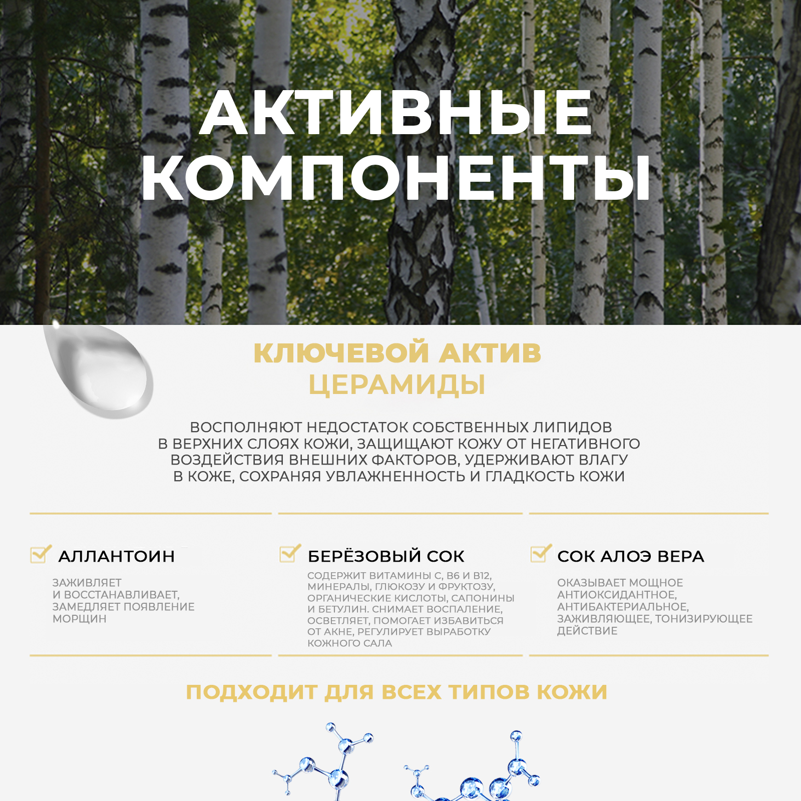 Березовый сок - по содержанию полезных веществ превосходит многие витаминные составы, в нем содержатся витамины С, В6 и В12, минералы (магний, натрий, кальций, калий, железо, фосфор, кремний и многие другие), глюкоза и фруктоза, органические кислоты, сапонины и бетулин. Бетулин стимулирует синтез коллагена, снимает воспаление в дерме, а также способствует отбеливанию пигментных пятен. Березовый сок, обладая антимикробной активностью, помогает избавиться от акне и их следов, регулирует выработку кожного сала.