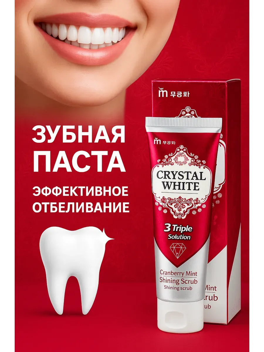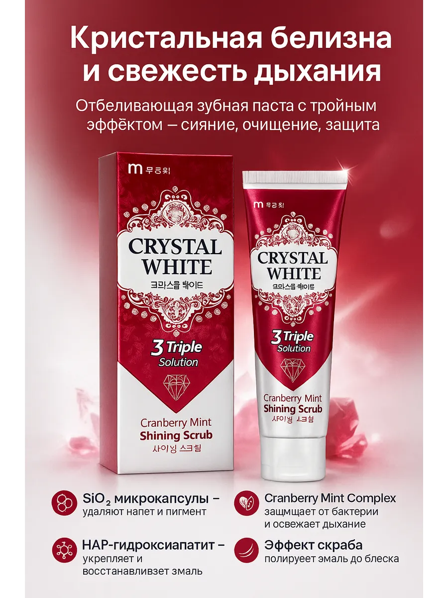 - Тройной комплекс из гидроксиапатита, диоксида кремния и полирующего вещества придает белизну и сияние зубам.