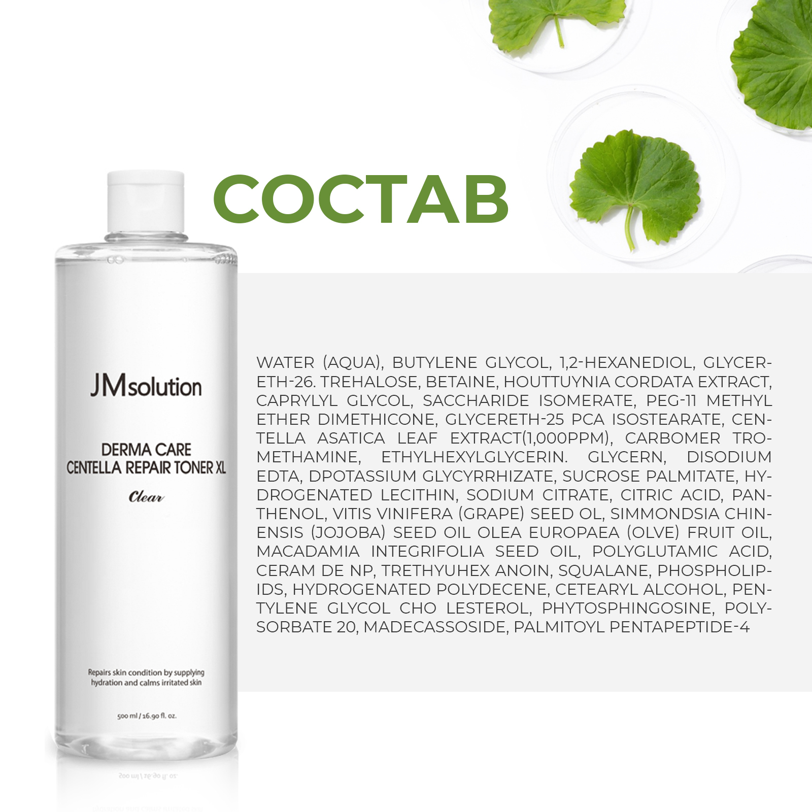 Восстанавливающий тонер с центеллой азиатской JMsolution Derma Care Centella Repair Toner XL Clear помогает укрепить кожный барьер, снизить воспаление, уменьшить покраснение и ускорить процесс заживления кожи. Тонер предназначен для увлажнения, успокоения и восстановления кожи, особенно чувствительной, раздраженной или склонной к акне. Формула тонера обогащена увлажняющими компонентами, которые помогают удерживать влагу в коже, предотвращая ее обезвоживание. Средство с pH 5 помогает поддерживать естественный уровень pH кожи, способствуя здоровью и увлажнению кожи.